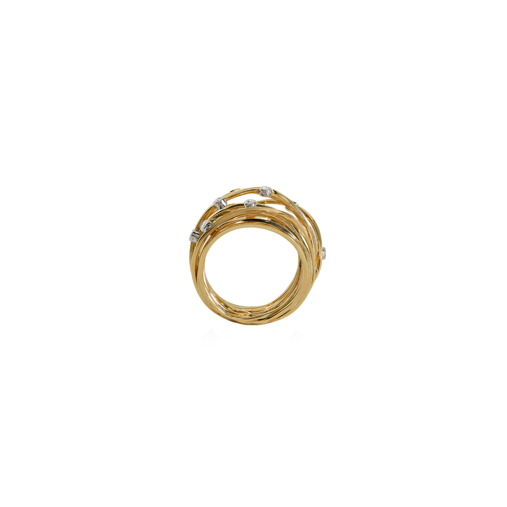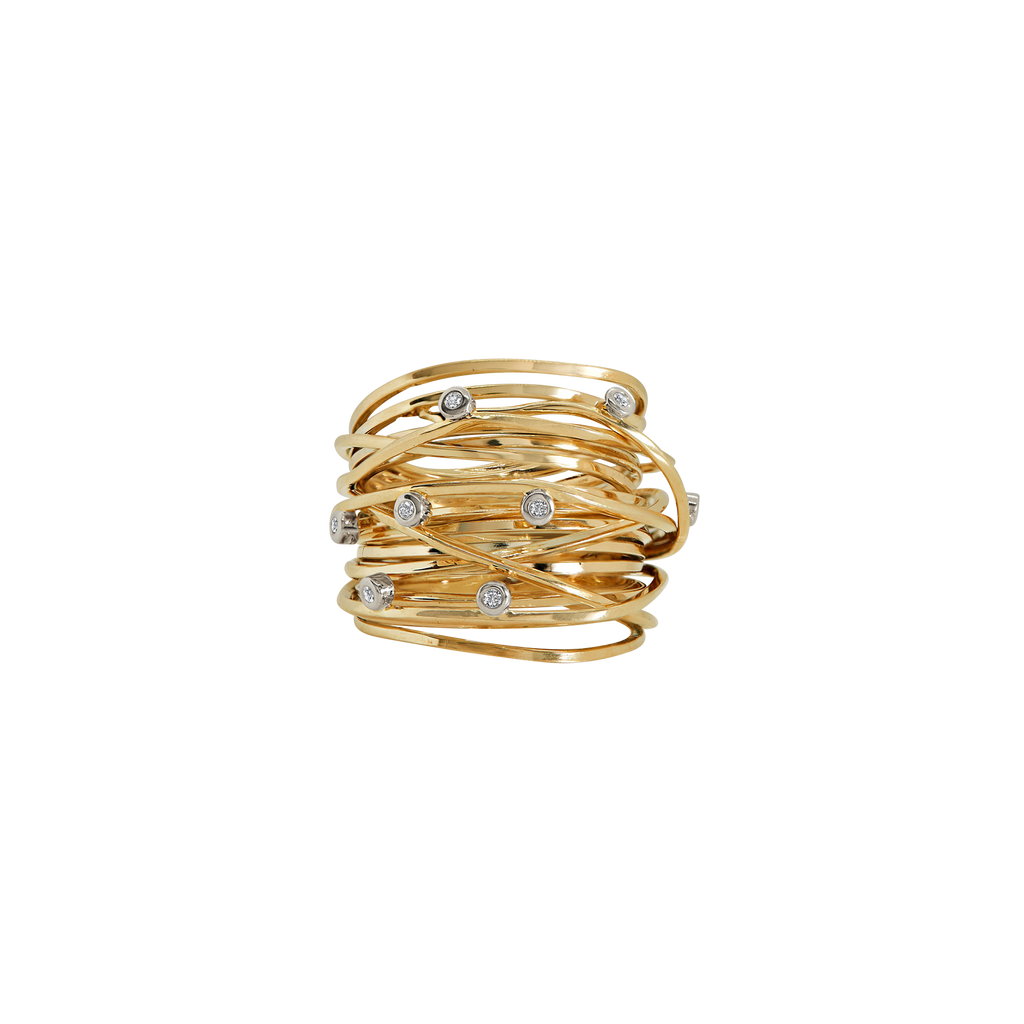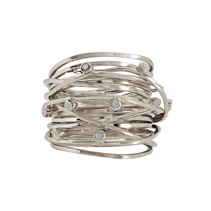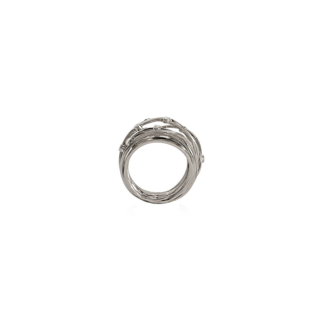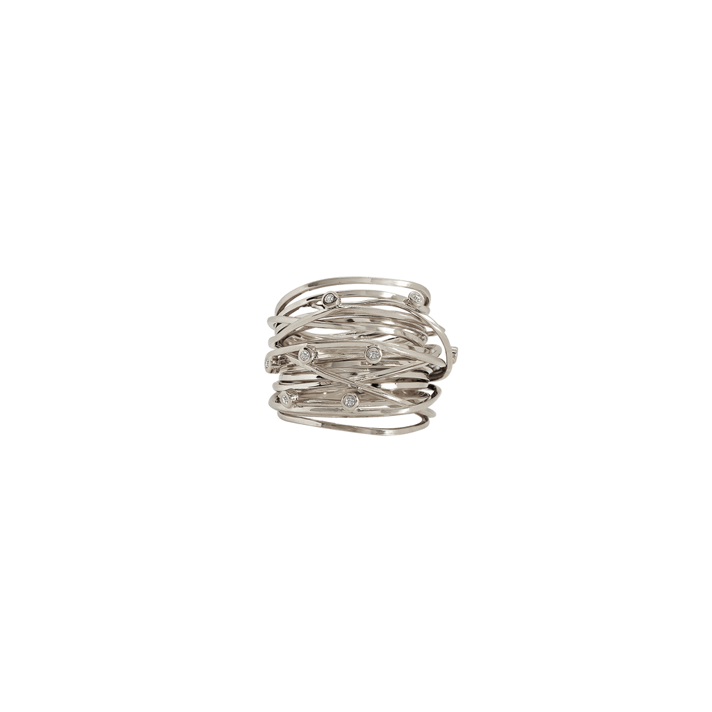 A lenticular cloud twisting and whirling around your finger. These clouds resemble thin disc-shaped layers of fluffy white cloud rising into the sky, looking like a whirlwind caught in time. This sculptural ring is handmade to order with a scattering of 10 round lab grown diamonds (total carat weight: 0.1ct).