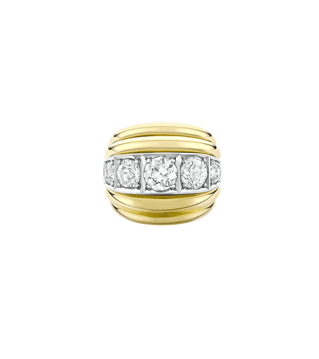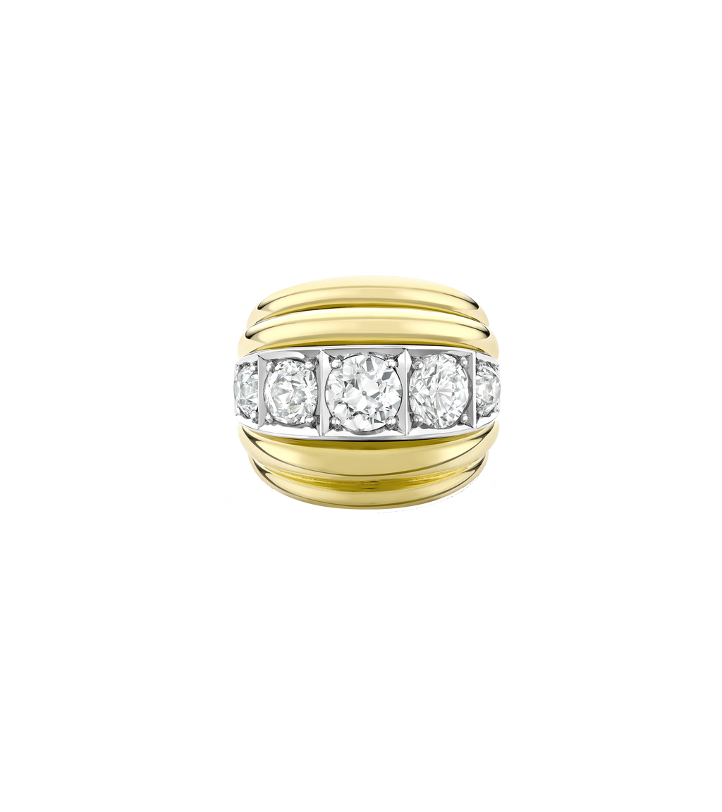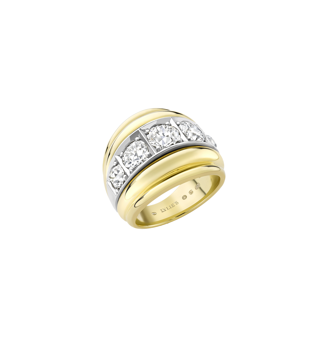 Our signature bombé-style ring is inspired by the oceans rippling waves. Featuring five valiant lab grown diamonds raised on platinum and 14ct salvaged gold ring body, this remodelled ring was fondly fashioned from a beloved piece that Lylie designed for herself.