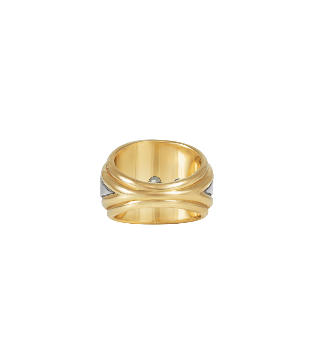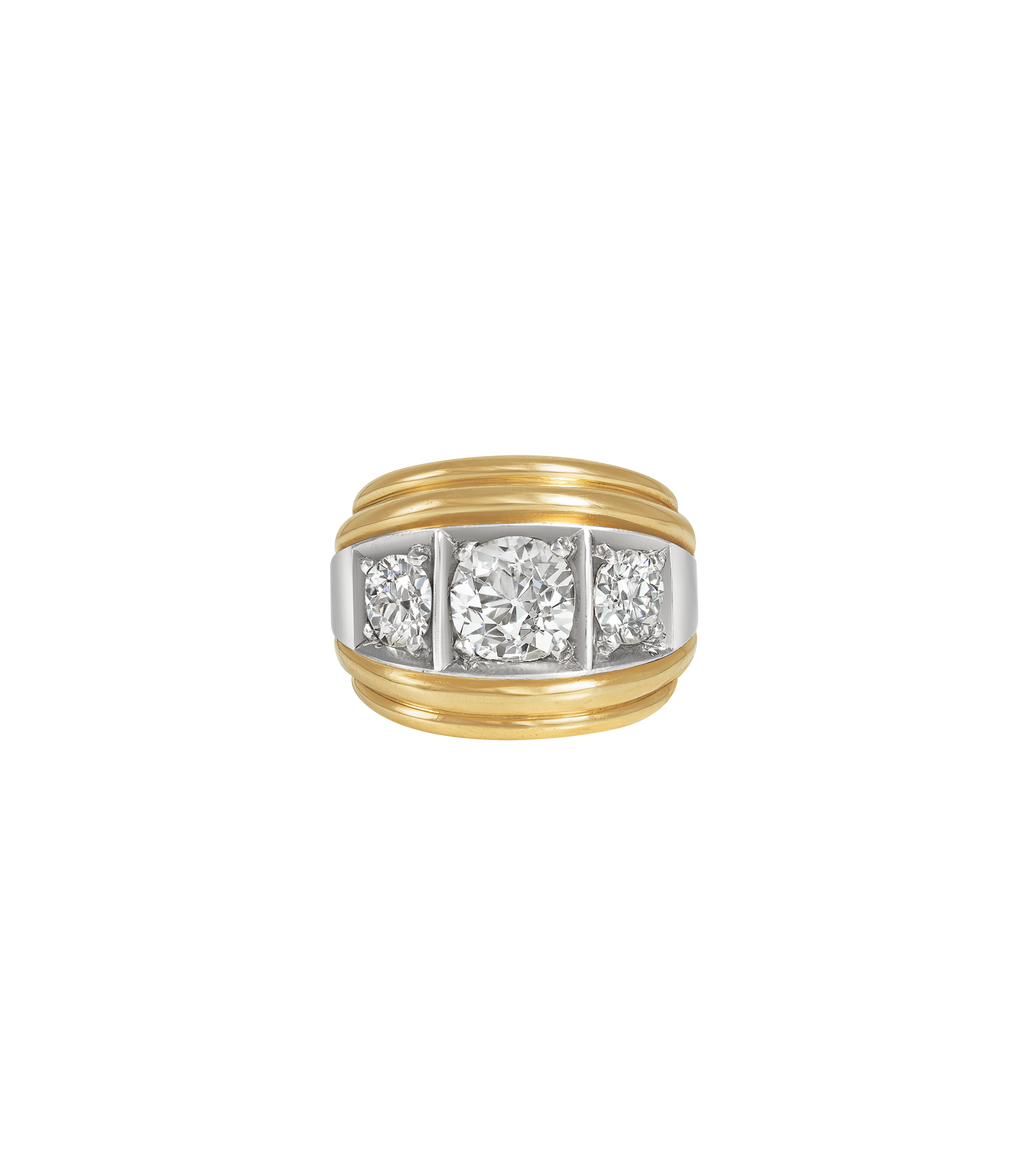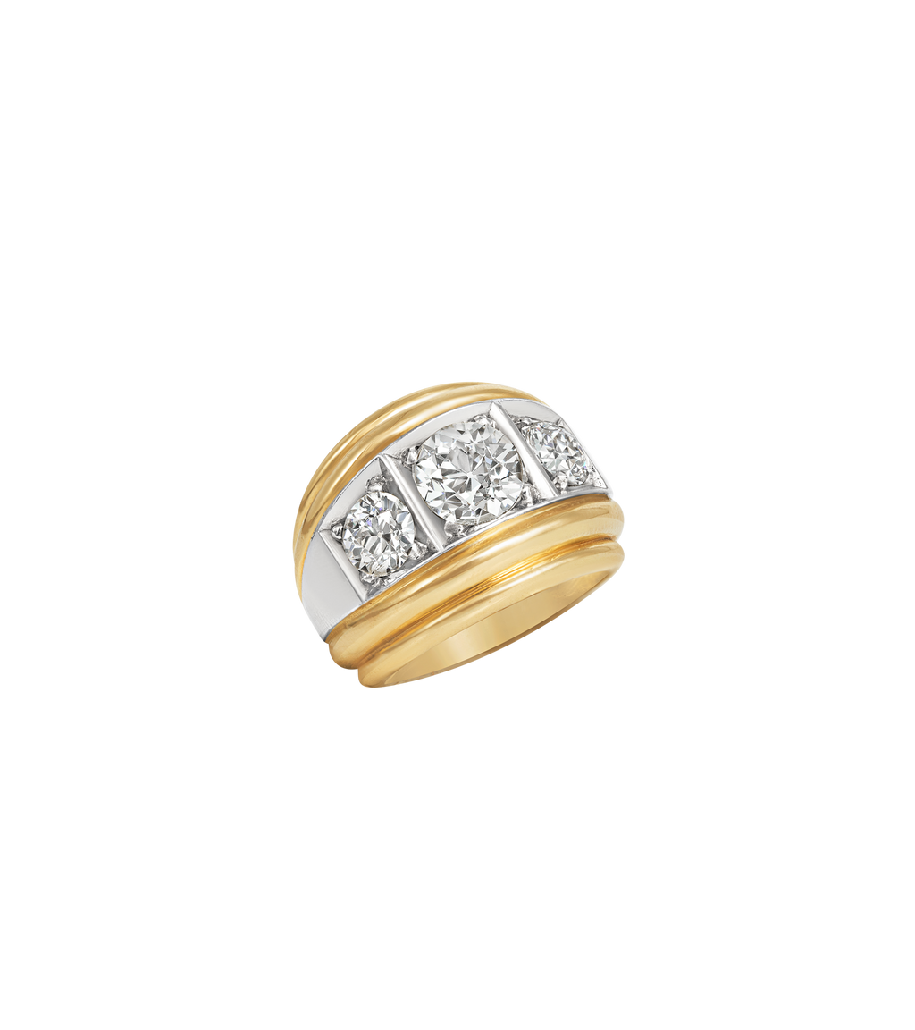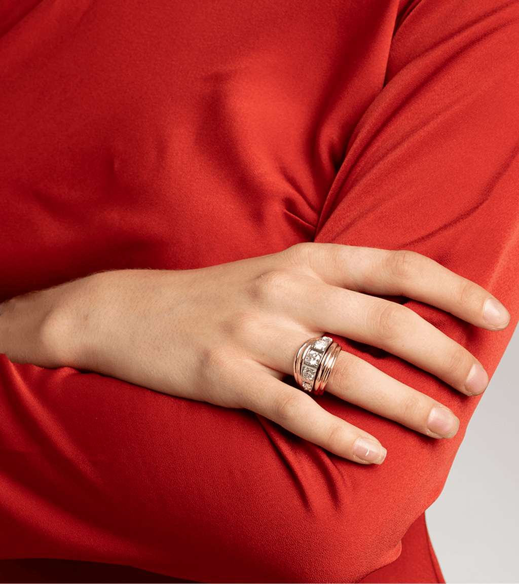 Our signature bombé-style ring is inspired by the oceans rippling waves. Featuring five valiant lab grown diamonds raised on platinum and 14ct salvaged gold ring body, this remodelled ring was fondly fashioned from a beloved piece that Lylie designed for herself.